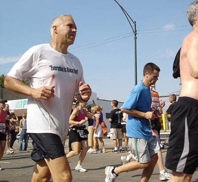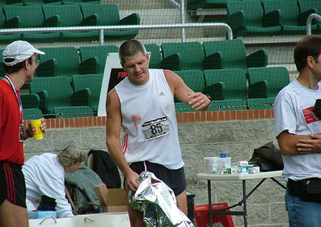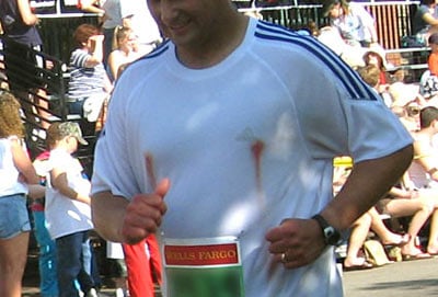 For those who may be unfamiliar with this phenomenon, it is called male nipple chafing, or sometimes, the “sad clown face”. The repeated abrasion between the skin and a wet shirt (particularly cotton) over thousands and thousands of strides eventually causes the below to happen. It’s completely preventable – band aids or a lubrication product called Body Glide will usually do the trick.